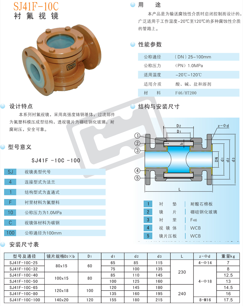 本產(chǎn)品是為輸送腐蝕性介質(zhì)時(shí)啟閉控制而設(shè)計(jì)的,廣泛用于工作溫度-20℃至120℃的多種腐蝕性介質(zhì)的管路上。本系列襯氟視鏡,采用高強(qiáng)度鑄鋼基體,過(guò)流部件為氟塑料模壓成型結(jié)構(gòu),透視鏡片為硼硅鋼化玻璃,耐腐耐壓,安全可靠。